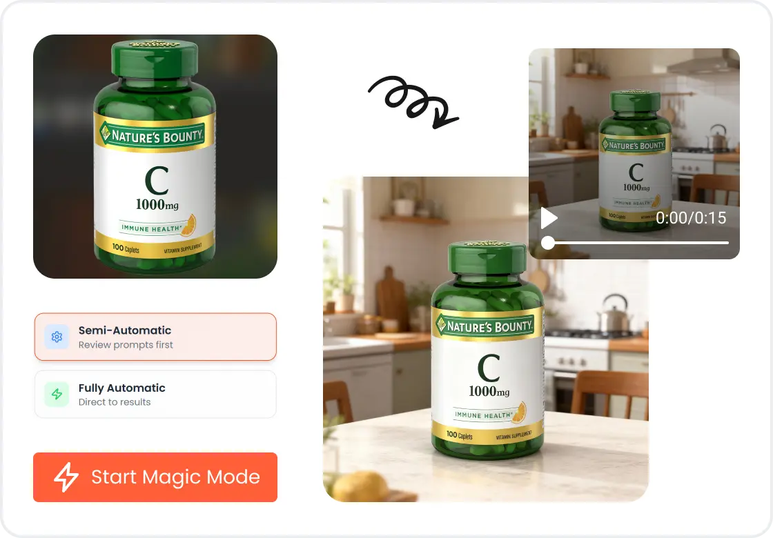 Stop juggling multiple tools. Magic Mode generates everything you need from one product photo—studio shots, lifestyle images, videos, and ad variations all at once.